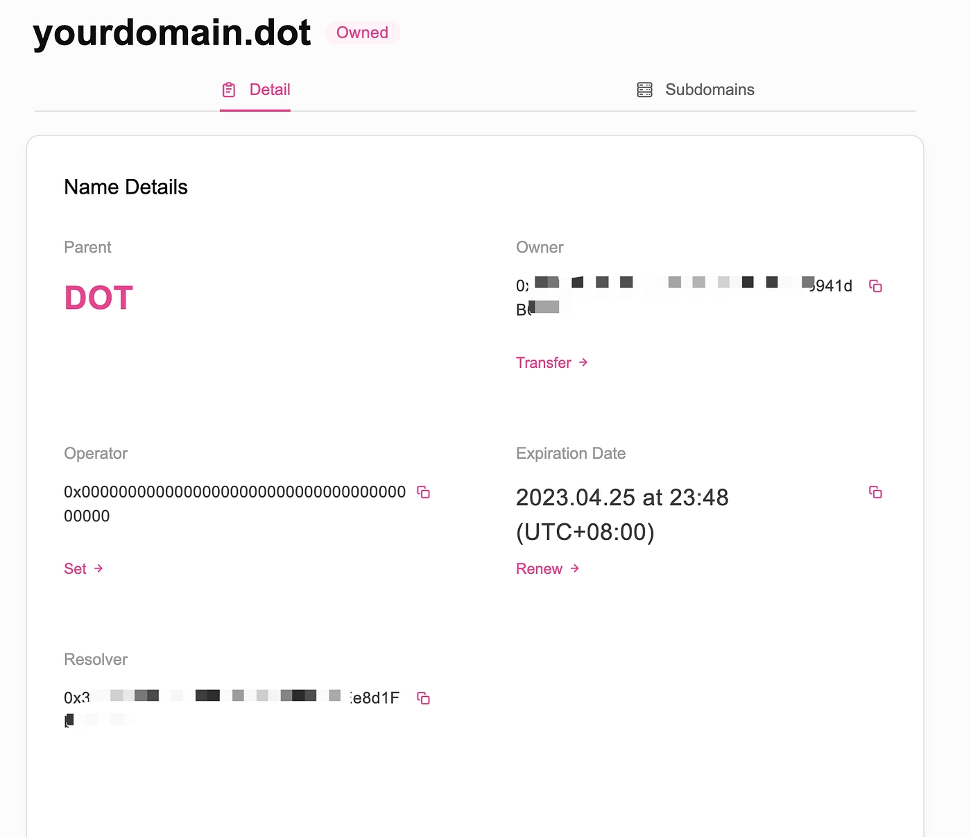 On the management page, you can transfer your domain to another Ethereum address and renew its expiration date. Keep in mind that transferring the domain to a different address will relinquish your ownership.