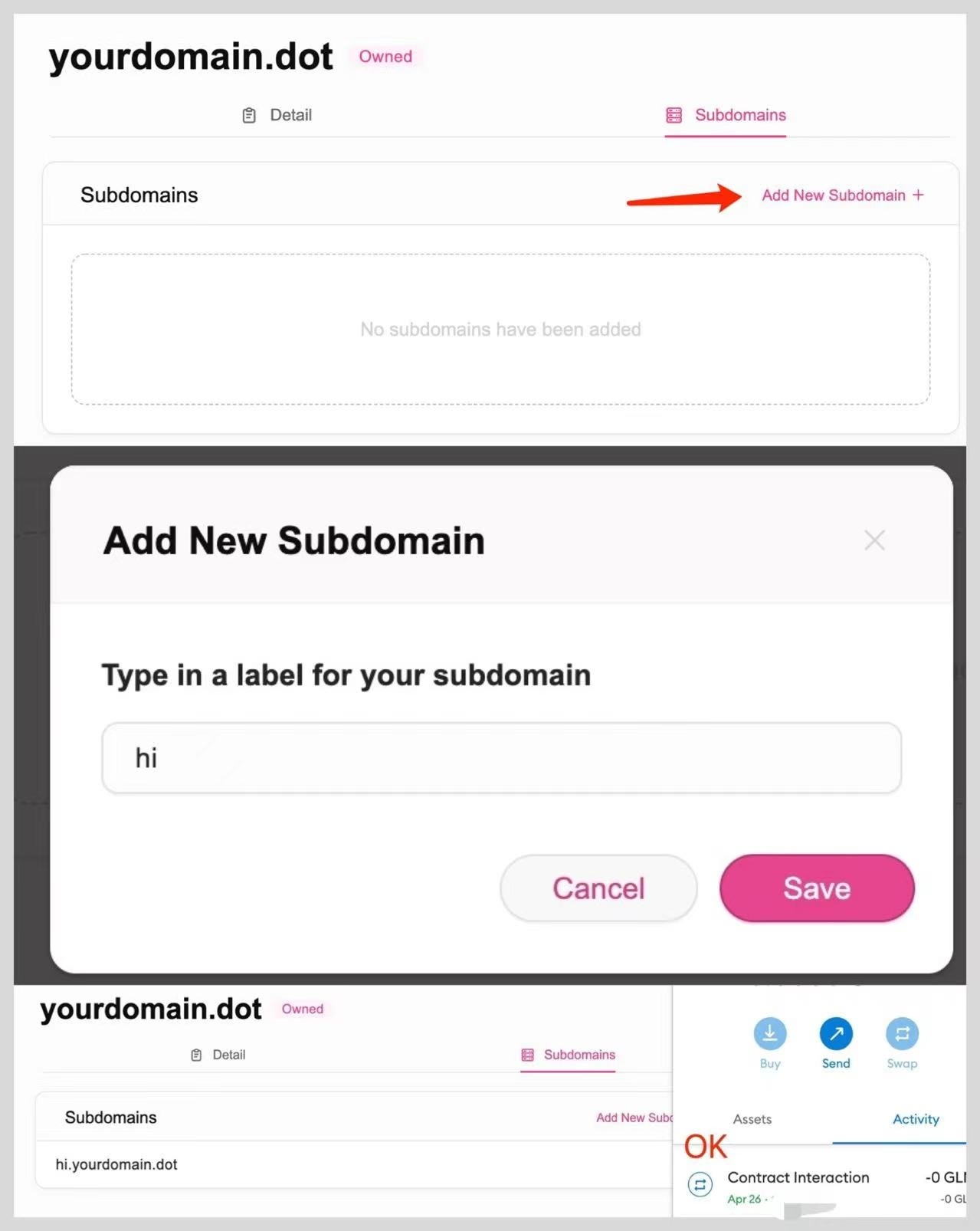 Click on Add New Subdomain to create a new subdomain. Enter the desired name for the subdomain and complete the payment for the gas fee. Once done, the new subdomain will be created, and you can edit its information.